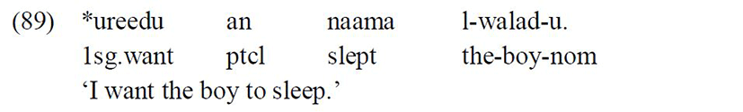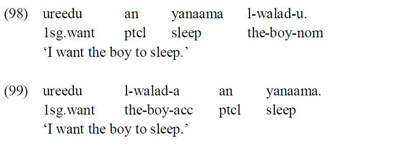The examples above show that the subject DP alwalad-a ‘the boy’ appears with an accusative Case marker, whether in the matrix or embedded clause, when preceded by a complementiser (FassiFehri 1993, Benmamoun 2000).
