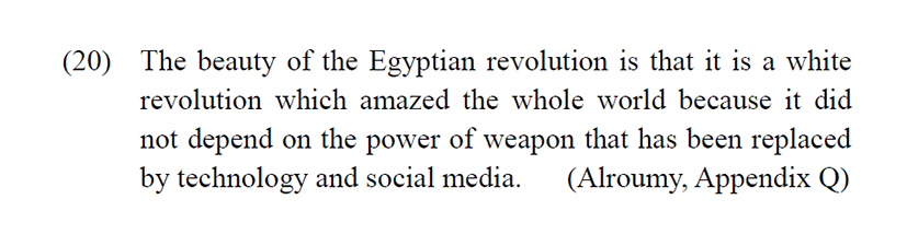 In example (7), ‘white revolution’ is used in a comparative context with ‘orange revolution’ to represent the underlying tactful relation for the attribution of the white color to the Egyptian revolution. The same designation is reused by a different speaker in example (20) to imply the different concept of peaceful revolution which is restated literally in the rest of the example. The white color is ascribed to the revolution to signpost its peacefulness where the peaceful uses of technology and social media in this revolution replace the uses of dangerous weapons. Yet, the metaphor of white color is used in example (20) to communicate the positive concept of peaceful revolution whereas it is used in example (7) to link between the Ukrainian orange revolution and the Egyptian white revolution in a tactful way.