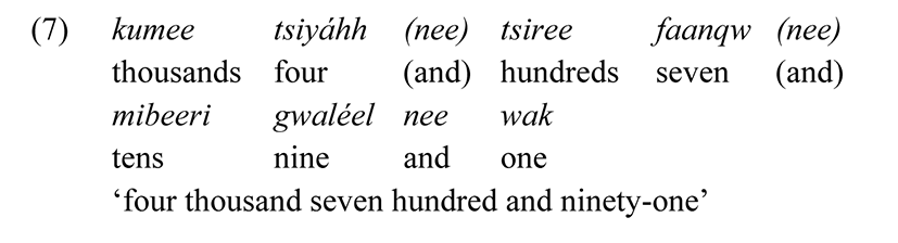As can be read in (6) tsiree koo'án (nee) mibeeri dakáat nee dakáat, the conjunction morpheme (nee) ‘and’ that adjoins hundreds with tens is optional, while the nee ‘and’ that joins base ten to basic (lower) numeral is obligatory. The extension of thousands becomes more complex with a series of multiplication and addition of base thousand, hundred and ten with a basic numeral. As seen in (7), nee is optional for extension of thousands.