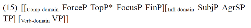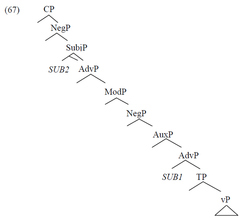 However, the tree diagram above shows a simplistic view of the actually more intricate and rich syntactic layer between the CP and TP heads. A syntactic mapping of all the possible categories that can project between these heads will give us a better understanding of the cartography of the CP-TP area (Rizzi 1997, Cinque 1999, Cardinaletti 2004). This will also show that the two proposed positions for the preverbal subject are not adjacent as it may appear.
