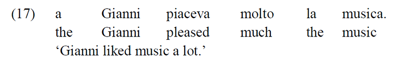 Cardinaletti argues that with Italian psych verbs either the theme or the experiencer can be preposed to the preverbal subject position (2004: 122):