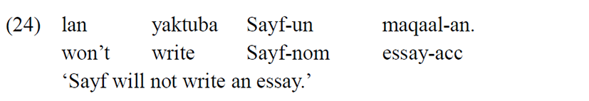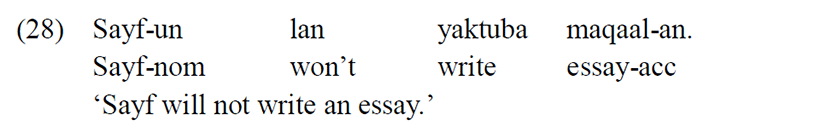 Negation in Standard Arabic can be expressed in the sentence by the occurrence of negation particles such as lam, lan, laa, and maa, among others (Ryding 2005). These particles can be categorised into three types; the first type includes negation particles like lam and lan that must be followed by the verb:
