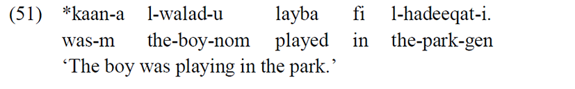 It is clear that the subject in Standard Arabic can precede the verb and surface in a position between the auxiliary and the verb. In this position, the subject agrees in number only with the main verb and agrees in gender with the main verb as well as the auxiliary: