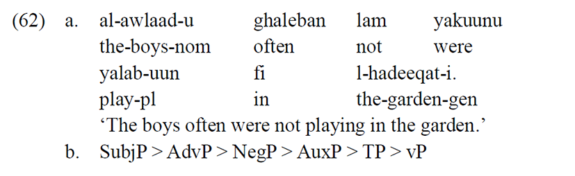 Consequently, we can assume that there exist two different positions for the preverbal subject in Standard Arabic. The first position is a specifier position below the adverbial phrase, and the second is a specifier position above the adverbial phrase.