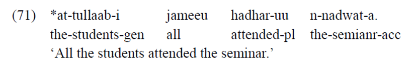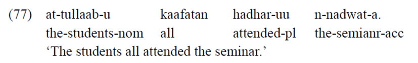 The concurrence of the subject and a floating quantifier in a preverbal position needs further investigation on the possible positions of both DPs. In standard Arabic, quantifiers like kullu and jameeu typically precede the quantified DP which surfaces with a genitive Case marker (Aoun et al. 2010, Fassi Fehri 2012):