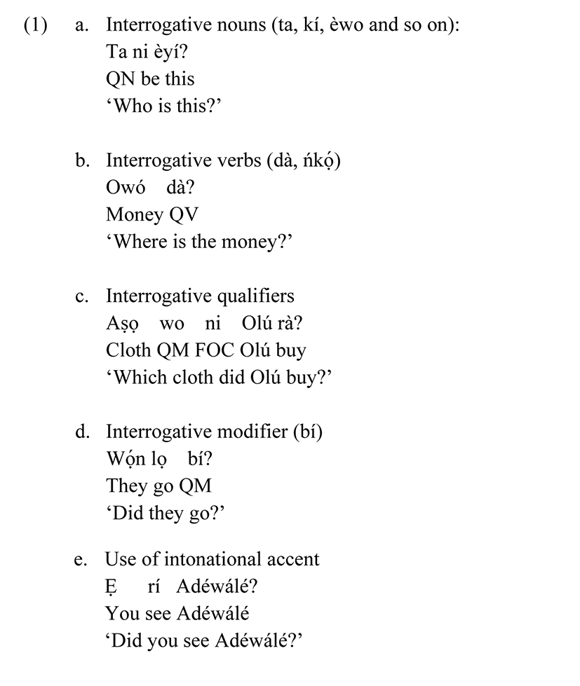 According to Bamgbose (1990: 183–186), the following items are operated to form questions in Yorùbá: interrogative nouns, interrogative verbs, question particles, interrogative conjunctions, interrogative modifiers, interrogative qualifiers and preverbal QMs.