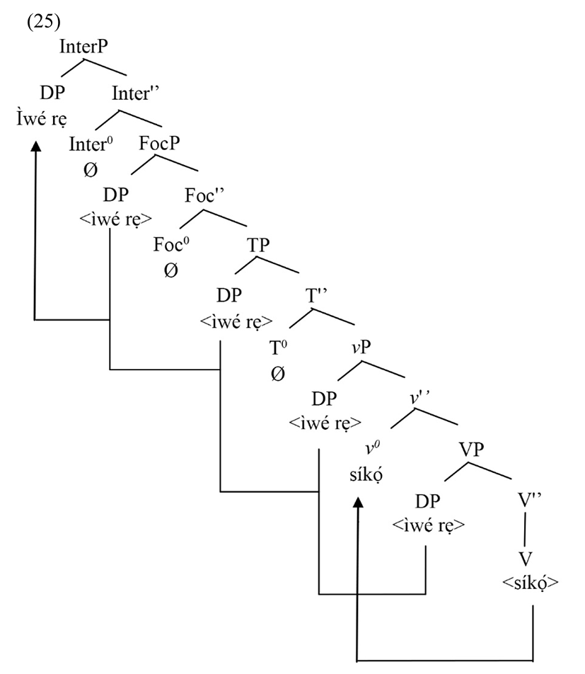 The derivation in (25) goes as follows: The DP ìwé rẹ ‘your book’ is externally merged with the QV síkọ́ to project the VP in line with the PISH. The null performative light verb v0 externally merges with the VP to project the v-bar. The strong vF on the performative light verb attracts the QV to adjoin to itself. The DP ìwé rẹ is attracted to the spec vP to be visible to subsequent syntactic operations. The derivation proceeds by merging the abstract T0 with the vP to project the T-bar. The T0 as a probe attracts the DP iwé rẹ̀ to the spec TP to check its [+case, EPP] feature. Ìwé rẹ is, therefore, a valued nominative case. The derivation proceeds by externally merging the abstract Foc0 with the TP to project the Foc-bar. The Foc0 as a potential probe attracts the DP ìwe rẹ to the spec FocP to check its [+Focus] feature. The derivation still proceeds by merging the abstract Inter0 with the FocP to project the Inter-bar. The Inter0 as a potential probe attracts the DP ìwé rẹ̀ to the spec InterP to check its [+EF] through specifier and head agreement. The [+Q] feature on the abstract Inter0 is too weak to trigger the overt movement of the DP ìwé rẹ. The focus projection is activated consequent upon the question-answer pair of this form of interrogative (Aboh 2007, Taiwo & Abimbola 2014). To accommodate the derivation above, Ọláńrewájú (2022: 166) proposes (27) below for Yorùbá and related languages in the place of Radford’s (2009) proposal repeated as (26) below for ease of reference: