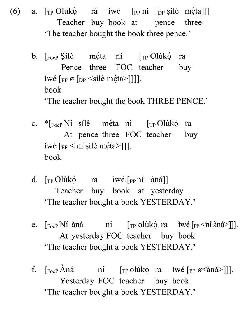 The preposition ni is not pied-piped with the QN, but gets deleted in (5d) above. It is assumed that the reason behind this irregularity is that èló “how much” is used to elicit information about price. This is not peculiar to èlo as a QN alone, it is also applicable to other nouns in this category. Let us consider the examples below: